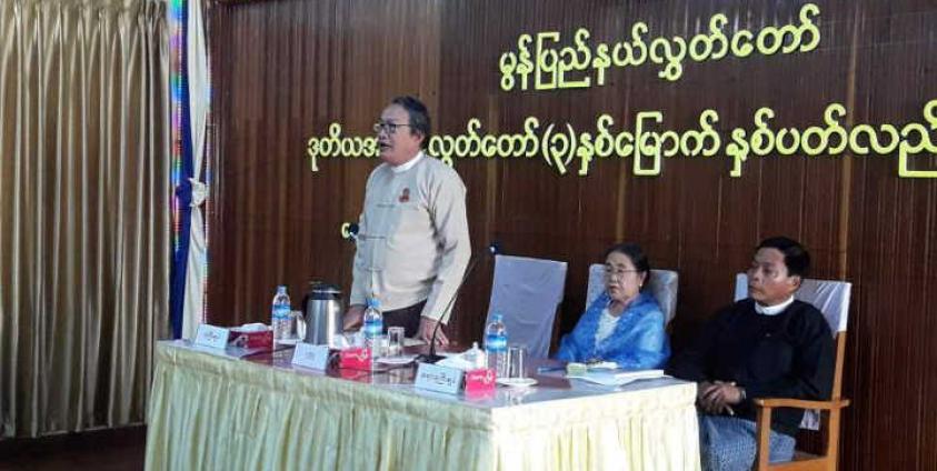 မွန်ပြည်နယ်ဒုတိယအကြိမ်လွှတ်တော် (၃) နှစ်ပြည့်နှစ်ပတ်လည်အခမ်းအနားတွင် မွန်ပြည်နယ်ဝန်ကြီးချုပ် ဒေါက်တာအေးဇံ မိန့်ခွန်းပြောကြားစဉ်(MNA)
