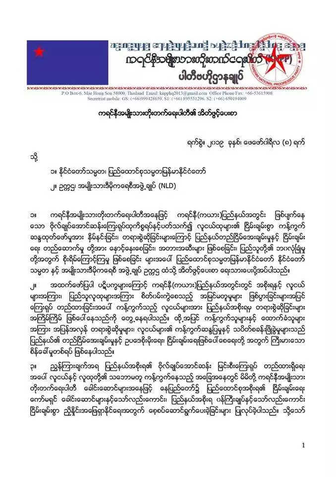 သို့ရာတွင် ကယားပြည်နယ်အတွင်း ပဋိပက္ခများ ဖြစ်ပေါ်နေခြင်းနှင့် တည်ငြိမ်အေးချမ်းမှုတို့အား မဆောက်တည်နိုင်ခြင်းသည် KNPP ပါတီမှ လက်ရှိ လျှောက်လှမ်းနေသည့် ငြိမ်းချမ်းရေးနှင့် နိုင်ငံရေး ဖြစ်စဉ်အပေါ် အဟန့်အတား ဖြစ်ပေါ်စေခြင်းကြောင့် ပြည်ထောင်စု အစိုးရသော်လည်းကောင်း၊ ဒီချုပ်ပါတီသော်လည်းကောင်း အမြန်ဆုံး အရေးယူဆောင်ရွက်ဖြေရှင်ပေးရန် တောင်းဆိုကြောင်း အိတ်ဖွင့်ပေးစာတွင် ဖော်ပြထားသည်။