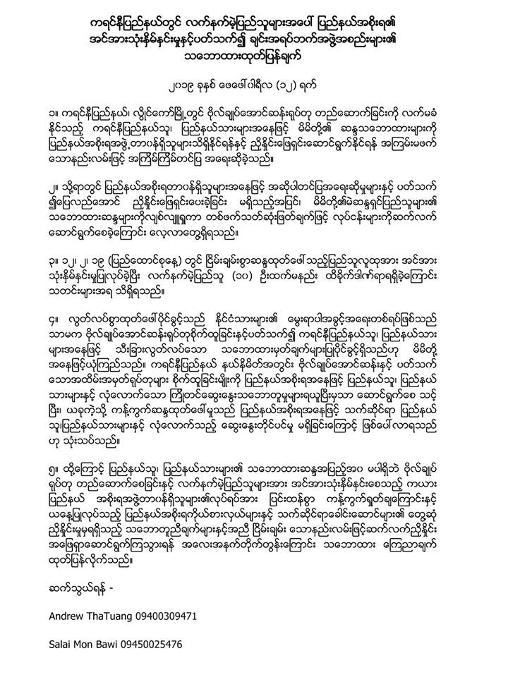 ထို့ကြောင့် ပြည်နယ်သူပြည်နယ်သားများ၏ သဘောထားဆန္ဒအပြည့်အဝမပါရှိဘဲ ဗိုလ်ချူပ်ကြေးရုပ်တည်ဆောက်စေခြင်းနှင့် လက်နက်မဲ့ပြည်သူများအား အင်အားသုံးနှိမ်နှင်းသည့် ကယားပြည်နယ်အစိုးရအဖွဲ့၏လုပ်ရပ်ကို ပြင်းထန်စွာ ဆန့်ကျင်ကန့်ကွက်ပြီး ပြည်နယ်အစိုးရအနေဖြင့် သက်ဆိုင်ရာဆန္ဒပြပြည်သူများနှင့် သဘောတူညီချက်ရရှိထားသည့် အချက်အများနှင့်အညီ ငြိမ်းချမ်းသောနည်းဖြင့် ဆက်လက်ညှိနှိုင်း အဖြေရှာဆောင်ရွက်သွားကြရန် အလေးအနက်တိုက်တွန်းသည်ဟု ကြေညာချက်တွင်ဖော်ပြထားသည်။