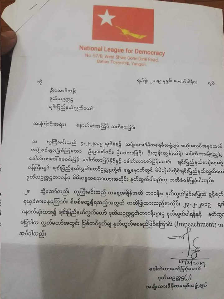 အကယ်၍ နှုတ်ထွက်ခြင်းမပြုပါက လွှတ်တော်အတွင်း ပြစ်တင်ရှုတ်ချ နှုတ်ထွက်စေမည်ဟု အဆိုပါ သတိပေးစာတွင် ဖော်ပြထားသည်။