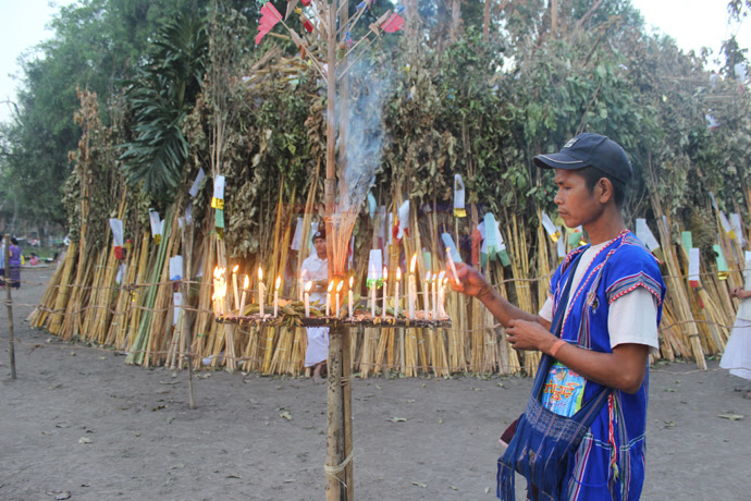 ဖြေ။ ။ အနယ်နယ်အရပ်ရပ်က တလဂုဏ်ဘာသာဝင်တွေဟာ မီးရှို့ပူဇော်ဖို့ မီးခုံတိုင်အတွက် ဝါးကို မယူဘဲ သက်ရင်း (သစ်အမျိုးအစား)တွေကို တောထဲမှာသွားခုတ်တယ်။ မိသားစုက ၅ ယောက်ဆို ၅ ချောင်း၊ ၁၀ ယောက်ဆို ၁၀ ချောင်းပေါ့။ မိသားစုအလိုက်ပေါ့။ သက်ရင်းကိုရွေးရတာက သူတို့က မွှေးတယ်။ အရင်က ဖယောင်းတိုင်မပေါ်သေးတော့ ဖယောင်းတိုင်သဘောအနေနဲ့သုံးတာပေါ့။ ခုတ်ပြီးရင် နနွင်း၊ နှမ်းဆီတွေနဲ့ သုတ်လိမ်း၊ အဲဒါပြီး ရှို့မယ့်နေရာမှာ စိုက်ထူပြီး စုပေါင်းမီးရှို့၊ မီးပူဇော်ကြတာပေါ့။ အရင်က မီးပုံ သေးသေးလေးပါပဲ။ တဖြည်းဖြည်း လူဦးရေများလာတော့ မီးပုံဟာလည်း ကြီးလာတာပေါ့။ အခုနှစ်ဆို ရွာပေါင်း ၁၂၀ ကျော်က လူတွေလာရောက် စုပေါင်းမီးပူဇော်ကြပါတယ်။