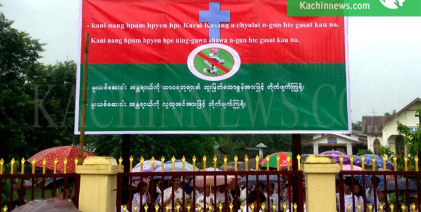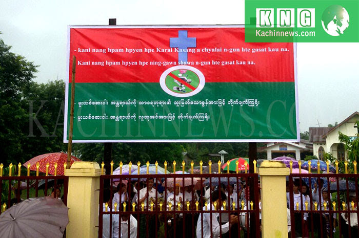 မြစ်ကြီးနားမြို့ Trinity ကချင်နှစ်ခြင်းခရစ်ယာန် အသင်းတော် ဘုရားကျောင်းရှေ့ မူးယစ်ဆေးဝါးဆန့်ကျင်ရေး PJS အဖွဲ့ ဆိုင်းဘုတ်