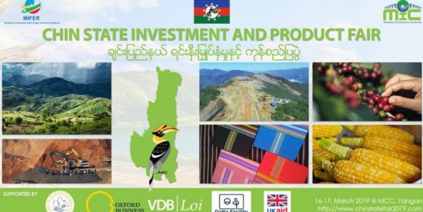 ပြည်တွင်း/ပြည်ပ စီးပွားရေးလုပ်ငန်းရှင်များအနေဖြင့် ချင်းပြည်နယ်အတွင်း ရင်းနှီးမြှပ်နှံမှု ပိုမိုလုပ်ကိုင်လာစေရေးအတွက်ရည်ရွယ်ပြီး ချင်းပြည်နယ်ရင်းနှီးမြှုပ်နှံမှုနှင့်ကုန်စည်ပြပွဲ (Chin State Investment and Product Fair 2019) ကို မတ်လ ၁၆ နှင့် ၁၇ ရက်နေ့များတွင် ရန်ကုန်ြမို့၊ မရမ်းကုန်းမြို့နယ်၊ မင်းဓမ္မလမ်းပေါ်ရှိ MCC ခန်းမတွင် ကျင်းပပြုလုပ်သွားမည်ဟု သိရသည်။