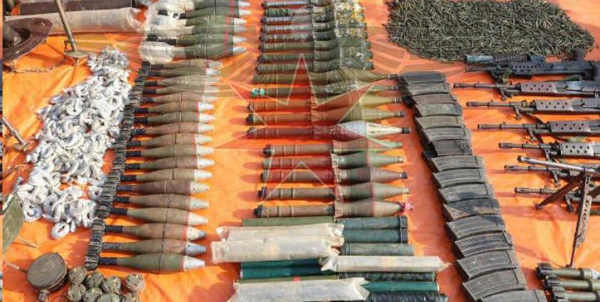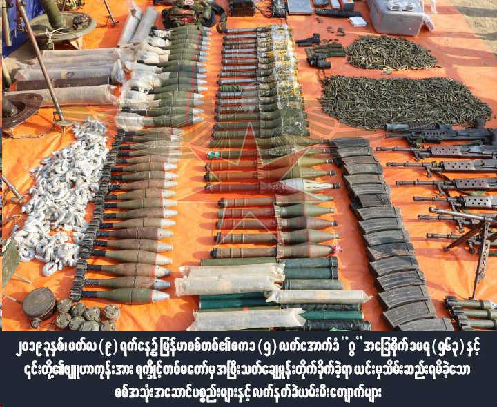 သိမ်းဆည်းရမိသည့် လက်နက်ခဲယမ်းမီးကျောက်များထဲတွင် ၈၁ မမပြောင်းရှည် (၁) လက်နှင့် ၎င်းဗုံးသီး ၁၄ လုံး၊ ၆၀ မမ ပြောင်းရှည် ချိန်ခွင်ပါ အစုံ(၂) လက်နှင့် ဗုံးသီး (၂၀) လုံး၊ ၆၀ မမ ပို့ယမ်းထုပ် (၂၃၁) ထုပ်၊ RPG-7ဗုံးသီး(၂၇) လုံးနှင့် ၎င်း ပို့ကျည် (၁၃) ခု၊ (၉) MA အမျိုးအစား လက်နက်ငယ် ၉ လက်နှင့် လက်နက်ငယ်ကျည် (၂၂၈၅) တောင့်၊ PHANTOM အမျိုးအစား Drone ဒရုန်းအဖြူ(၂) စီး အပါအဝင် မိုင်းရှာစက်များ၊ ကွန်ပြူတာ လက်တော့များ၊ ဆက်သွယ်ရေး အထိုင်စက်ကြီးများကို သိမ်းဆည်းရမိကြောင်း ၎င်းက ဆက်လက် ပြောဆိုသည်။
