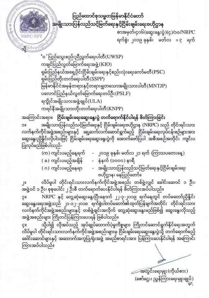 အမျိုးသားပြန်လည်သင့်မြတ်ရေးနှင့် ငြိမ်းချမ်းရေးဗဟိုဌာန NRPC က တစ်နိုင်ငံလုံးပစ်ခတ်တိုက်ခိုက်မှုရပ်စဲရေး သဘောတူစာချုပ် NCA လက်မှတ်မရေးထိုးသေးသည့် တိုင်းရင်းသားလက်နက်ကိုင် ၈ ဖွဲ့တို့အား ငြိမ်းချမ်းရေးဆွေးနွေးပွဲတက်ရောက်ရန် ၂၀၁၉ ခုနှစ် မတ်လ ၁၃ ရက်နေ့စွဲဖြင့် ဖိတ်ကြားထားကြောင်း သတင်းရရှိသည်။