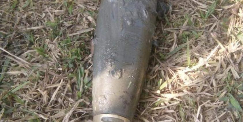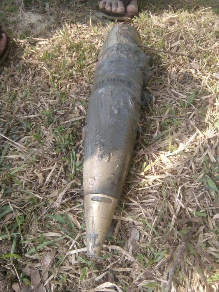 (ဓာတ်ပုံ- မပေါက်ကွဲသေးသည့် နာဂရာ ကျေးရွာသို့ ကျရောက်ခဲ့သည့် လက်နက်ကြီးကျည်)