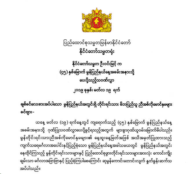 မွန်ပြည်နယ်သည် မွန်နှင့် ဗမာလူမျိုးအများဆုံးနေထိုင်ကြပြီး ကချင်၊ ကရင်၊ ချင်း၊ ရခိုင်၊ ရှမ်း၊ ပအိုဝ်း စသည့် ညီအစ်ကိုယ်မောင်နှမများပါ အတူတကွချစ်ကြည်ရင်းနှီးစွာ နေထိုင်ကြသည့်ပြည်နယ်တစ်ခုဖြစ်ပါကြောင်း၊ ၁၉၄၇ ခုနှစ် ဖွဲ့စည်းအုပ်ချုပ်ပုံအခြေခံဥပဒေ(မူကြမ်း) တွင် မွန်ပြည်နယ်အဖြစ် စတင်ကမ္ဗည်းတင်ရေးသားခဲ့သည့် ၁၉၄၇ ခုနှစ်၊ မတ်လ (၁၉) ရက်နေ့ကို မွန်ပြည်နယ်နေ့အဖြစ် သတ်မှတ်ကာ အထိန်းအမှတ်အခမ်းအနား နှစ်စဉ်ကျင်းပခဲ့သည်မှာ ယနေ့ဆိုလျှင် (၄၅) နှစ်တိုင်တိုင် ရောက်ရှိပြီဖြစ်ပါကြောင်း ဖော်ပြပါရှိသည်။