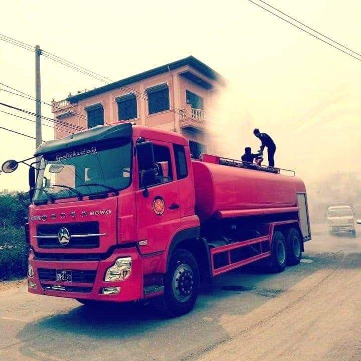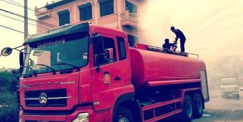 Photo Credit to တာချီလိတ်ခရိုင်အထွေထွေအုပ်ချုပ်ရေးဦးစီးဌာန ၊ တာချီလိတ်မြို့တွင်း မီးသတ်ကားများဖြင့် ရေများပက်ဖြန်းပေးနေစဉ်