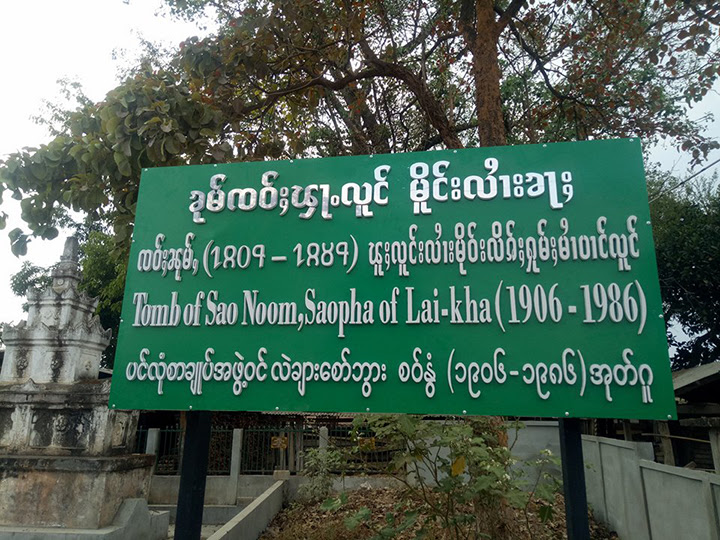 လွတ်လပ်ရေးသမိုင်းဝင် လဲချားစော်ဘွားကြီးစဝ်နွံ၏အုတ်ဂူတွင် သျှမ်း၊ မြန်မာ၊အင်္ဂလိပ် ၃ ဘာသာပါသော ဆိုင်းဘုတ် လဲချားသျှမ်းလူငယ်များစိုက်ထူ