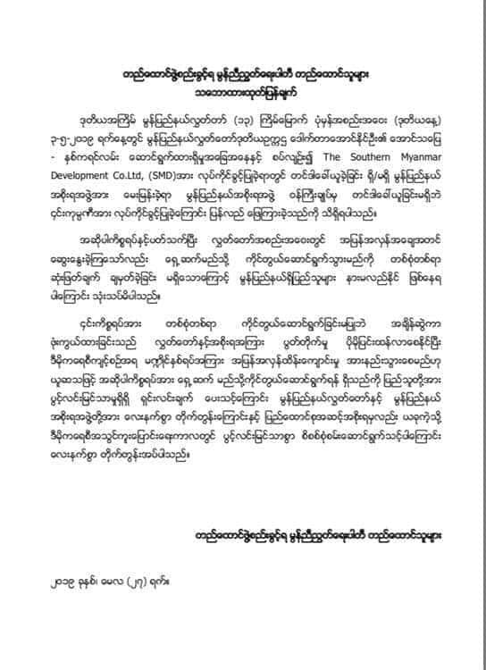 ယင်းသဘောထားထုတ်ပြန်ချက်ကို မေလ(၂၇)ရက်နေ့တွင် ထုတ်ပြန်ခဲ့ခြင်းဖြစ်ပြီး တင်ဒါမခေါ်ပဲ ကုမ္ပဏီအားလုပ်ပိုင်ခွင့်ပေးအပ်ခဲ့ခြင်းနှင့်ပတ်သက်၍ လွှတ်တော်နှင့် အများပြည်သူအကြားတွင်အချေအတင်ဆွေးနွေးခဲ့ကြသော်လည်း တစ်စုံတစ်ရာဆုံးဖြတ်ချက်ချမှတ်ခဲ့ခြင်းမရှိခဲ့သည့်အတွက်ကြောင့် ပြည်သူများနားမလည်နိုင်ဖြစ်ရကြောင်း၊ ပြည်နယ်လွှတ်တော်နှင့်ပြည်နယ်အစိုးရမှလည်း ပြည်သူများအား ပွင့်လင်းမြင်သာစွာချပြသင့်ကြောင်း နှင့် ပြည်ထောင်စုအဆင့်အစိုးရမှလည်း ပွင့်လင်းမြင်သာစွာ စိစစ်စုံးစမ်းသင့်ပါကြောင်း တိုက်တွန်းထားသည်။