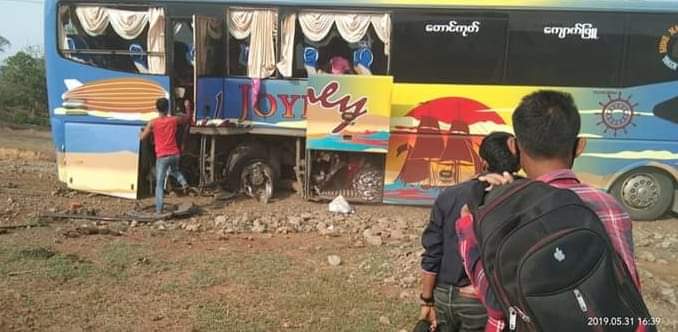 ရခိုင်ပြည်နယ်၊ မြေပုံမြို့နယ်၊ စစ်တွေ- ရန်ကုန်ကားလမ်းပေါ်တွင် ခရီးသည် ၄၄ ဦးကို တင်ဆောင်လာသည့် ရွှေမန်းရတနာကား ယနေ့ ညနေက မိုင်းပေါက်ကွဲ ထိမှန်ခဲ့သည်ဟု သတင်းရရှိသည်။