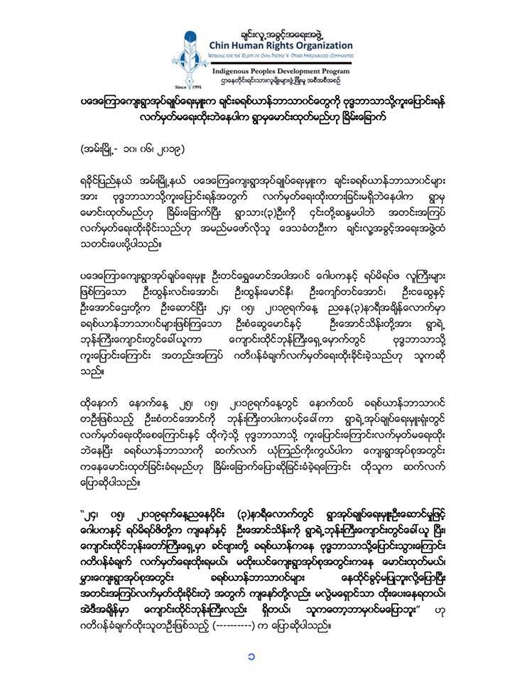 ရခိုင်ပြည်နယ် အမ်းမြို့နယ် ပဒေကြေကျေးရွာတွင် နေထိုင်သည့် ချင်းခရစ်ယာန်ဘာသာဝင်များကို ခရစ်ယာန်ဘာသာမှ ဗုဒ္ဓဘာသာသို့ ကူးပြောင်းကြောင်း လက်မှတ်ရေးထိုးထားခြင်းမရှိပါက ရွာမှမောင်း ထုတ်မည်ဟု ပဒေကြေကျေးရွာအုပ်ချုပ်ရေးမှူးနှင့် ရပ်မိရပ်ဖလူကြီးများမှ ခရစ်ယာန်ဘာသာဝင်များ ဆန္ဒမပါဘဲ လက်မှတ်အတင်း အကြပ်ရေးထိုးခိုင်းကြောင်း ဒေသခံတဦးမှ ချင်းလူ့အခွင့်အရေး(CHRO)အဖွဲ့ထံ သတင်းပေးပို့ကြောင်း CHRO ၏ Field Director Salai Terah ကပြောသည်။