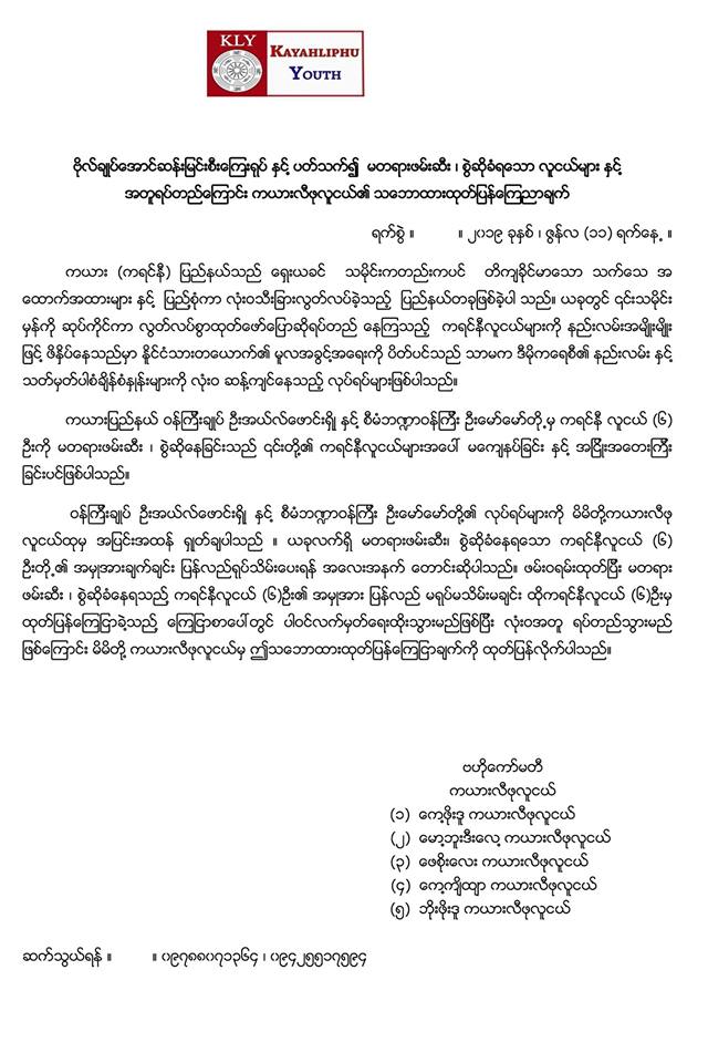 ၎င်းတို့၏လုပ်ရပ်များကို ကယားလီဖုလူငယ်ထုမှ အပြင်းအထန် ရှုပ်ချပြီး တရားစွဲဆိုထားသည့်အမှုကို ပြန်လည်ရုပ်သိမ်းပေးရန် အလေးအနက်တောင်းဆိုထားသည်။
