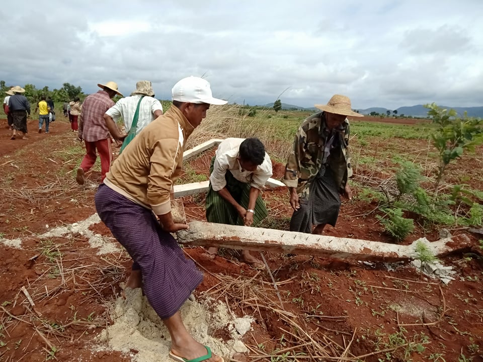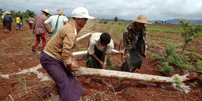 စစ်တပ်မှ တပ်သိမ်းမြေနေရာတွင် အုတ်တံတိုင်းခတ်ရန် တိုင်များစိုက်ထူနေမှုကို တောင်သူများက ဖယ်ရှား