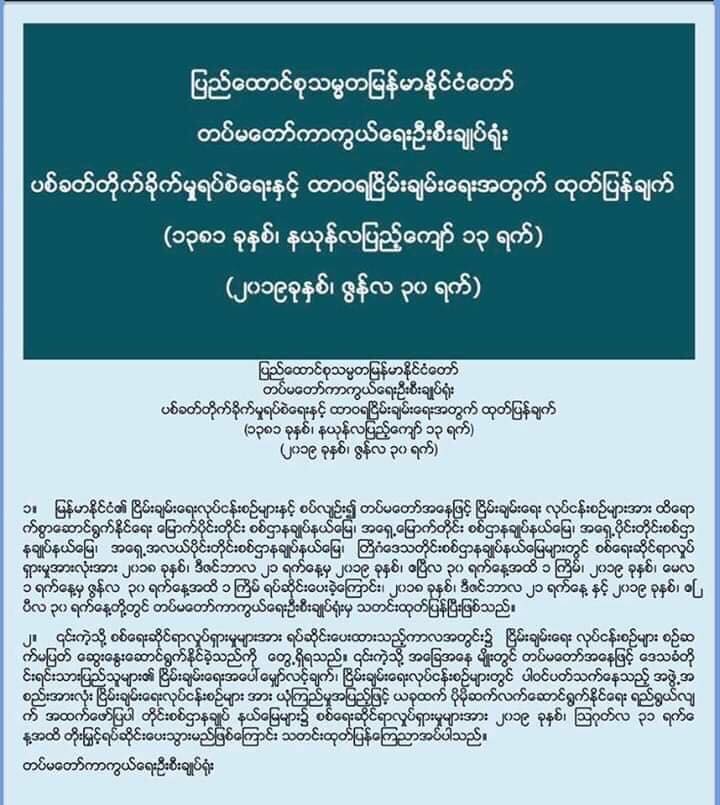 ဒေသခံတိုင်းရင်းသားပြည်သူများ၏ ငြိမ်းချမ်းရေးအပေါ်မျှော်လင့်ချက် ငြိမ်းချမ်းရေးလုပ်ငန်းစဉ်များအား ယုံကြည်မှုအပြည့်ဖြင့် ပိုမိုဆောင်ရွက်နိုင်ရေး ရည်ရွယ်ချက်ဖြင့် အပစ်ရပ်ကာလ ၂ လထပ်မံတိုးမြှင့်ပေးခြင်း ဖြစ်ကြောင်း တပ်မတော်ကာကွယ်ရေးဦးစီးချုပ်ရုံးမှ ဇွန်လ ၃၀ ရက်နေ့ ကြေငြာချက် ထုတ်ပြန်ခဲ့သည်။