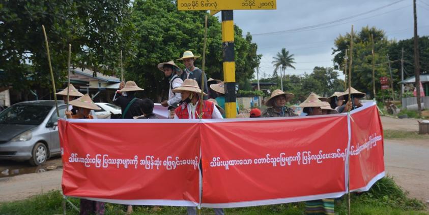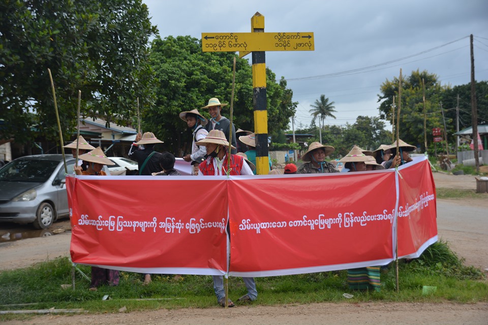 ၎င်းဆန္ဒပြပွဲတွင် ကိုင်ဆောင်ထားသည့် ဗွီနိုင်းများတွင် စစ်တပ်ဆိုသည့် စကားလုံးကို တိတ်ဖြင့် မသိမသာလေး ပိတ်ထားပြီး ကျန်သည့် စာသားများဖြစ်သော သိမ်းဆည်းမြေ ပြဿနာများကို အမြန်ဆုံး ဖြေရှင်းပေးရေး၊ သိမ်းယူထားသော တောင်သူမြေများကို ပြန်လည်ပေးအပ်ရန် ၊ ဖမ်းဆီးထိန်းသိမ်းထားသော တောင်သူများကို ပြန်လည်လွှတ်ပေးရန် စသည့် ဆိုင်းဘုတ်များကို ကိုင်ဆောင်လျက်ရှိနေတာကို တွေ့ရပါသည်။