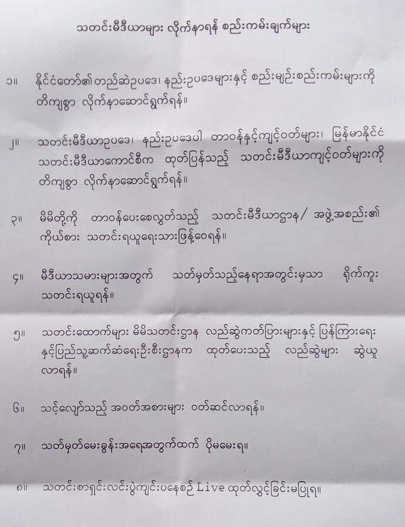 ယခုပြုလုပ်မည့် သတင်းစာရှင်းလင်းပွဲတက်ရောက်မည့် မီဒီယာသမားများအတွက် လိုက်နာရမည့် စည်းကမ်းချက် (၈) ချက်ကိုလည်း ချင်းပြည်နယ်အစိုးရအဖွဲ့က ထုတ်ပြန်လိုက်ပြီး သတ်မှတ်မေးခွန်ထက်ပိုမပေးရန်နှင့် သတင်းစာရှင်းလင်းပွဲ ကျင်းပနေစဉ်အတွင်း Live ထုတ်လွှင့်ခြင်းမပြုရဟု ပါရှိသည်။