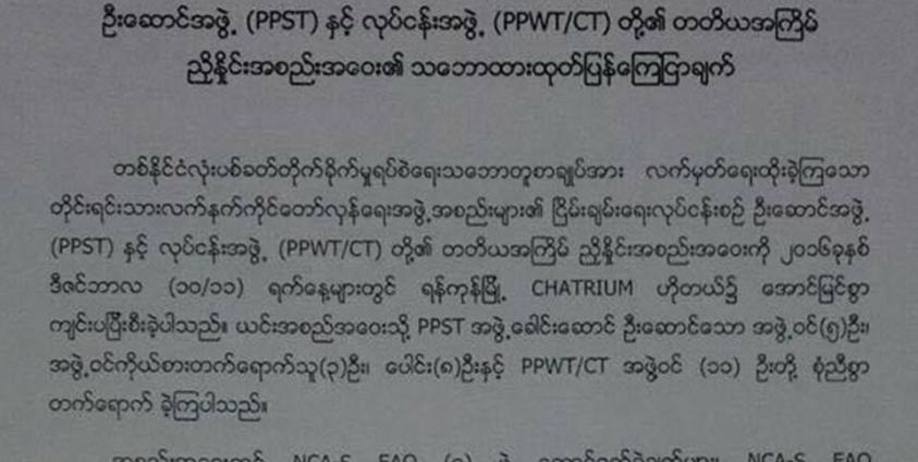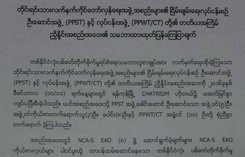 NCA သဘောတူစာချူပ် လက်မှတ်ရေးထိုုးခဲ့ကြသည့် တိုုင်းရင်းသား လက်နက်ကိုုင် တော်လှန်ရေး အဖွဲ့အစည်းများ၏ ငြိမ်းချမ်းရေး လုုပ်ငန်းစဉ် ဦးဆောင်အဖွဲ့ PPST နှင့် လုုပ်ငန်းအဖွဲ့ PPWT/CT အဖွဲ့ဝင်များ ဒီဇင်ဘာလ ၁၁ ရက်နေ့တွင် ရန်ကုုန်မြို့၌ ကျင်းပခဲ့သော တတိယအကြိမ် ညှိနှိုင်းအစည်းအဝေး အပြီးတွင် ယခုုလိုု ထုုတ်ပြန်လုုိက်ခြင်းဖြစ်သည်။