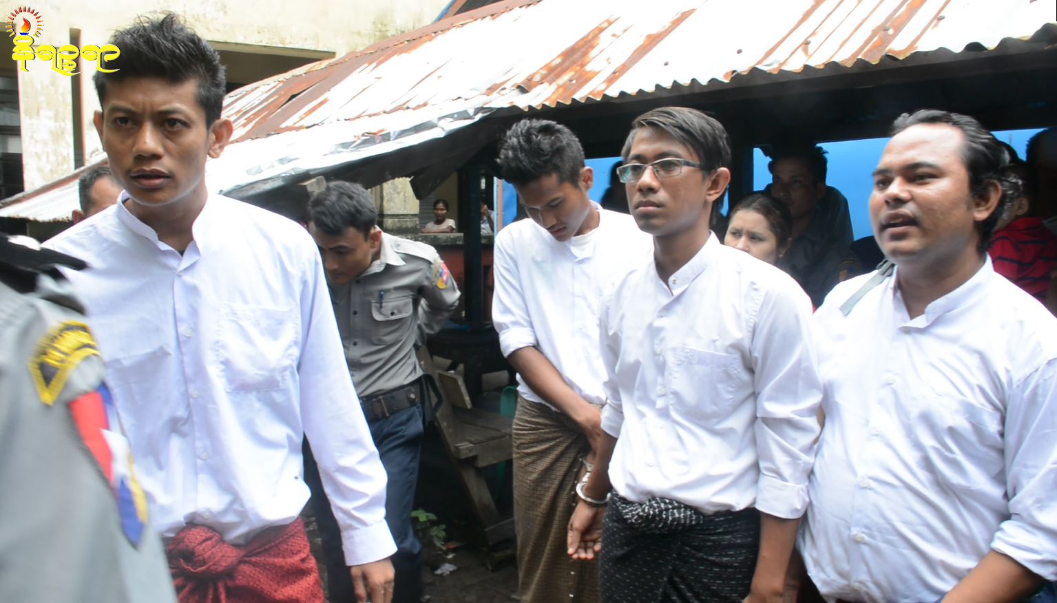 ဓာတ်ပုံ - တရားစွဲခံနေရသည့် ရခိုင်လူငယ် ၄ ဦးကို ဇူလိုင်  ၈ ရက်နေ့ ရုံးချိန်းတွင် တွေ့ရစဉ်။