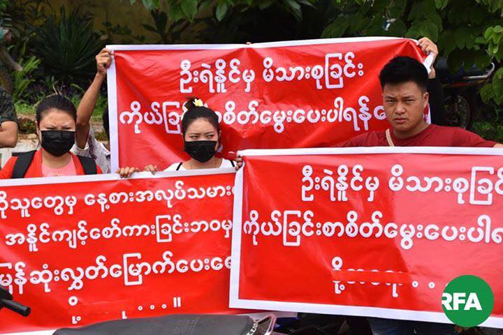 Gold Luck Water Park ပိုင်ရှင် ဦးရဲနိုင် မှ ဆေးသုတ်လုပ်အားခ များအား အမြန်ဆုံးရှင်းပေးရန်၊ နေ့စားအလုပ်သမားများအား အနိုင်ကျင့်စော်ကားခြင်း ဘဝမှ အမြန်ဆုံးလွှတ်မြောက်ပေးရန် ၊ ဦးရဲနိုင်မှ မိသားစုချင်းကိုယ်ချင်းစာစိတ်ထားပေးရန်စသည့် ပို့စတာများ ကိုင်ဆောင်ပြီး ဆန္ဒ ထုတ်ဖော်ခဲ့ကြသည်။