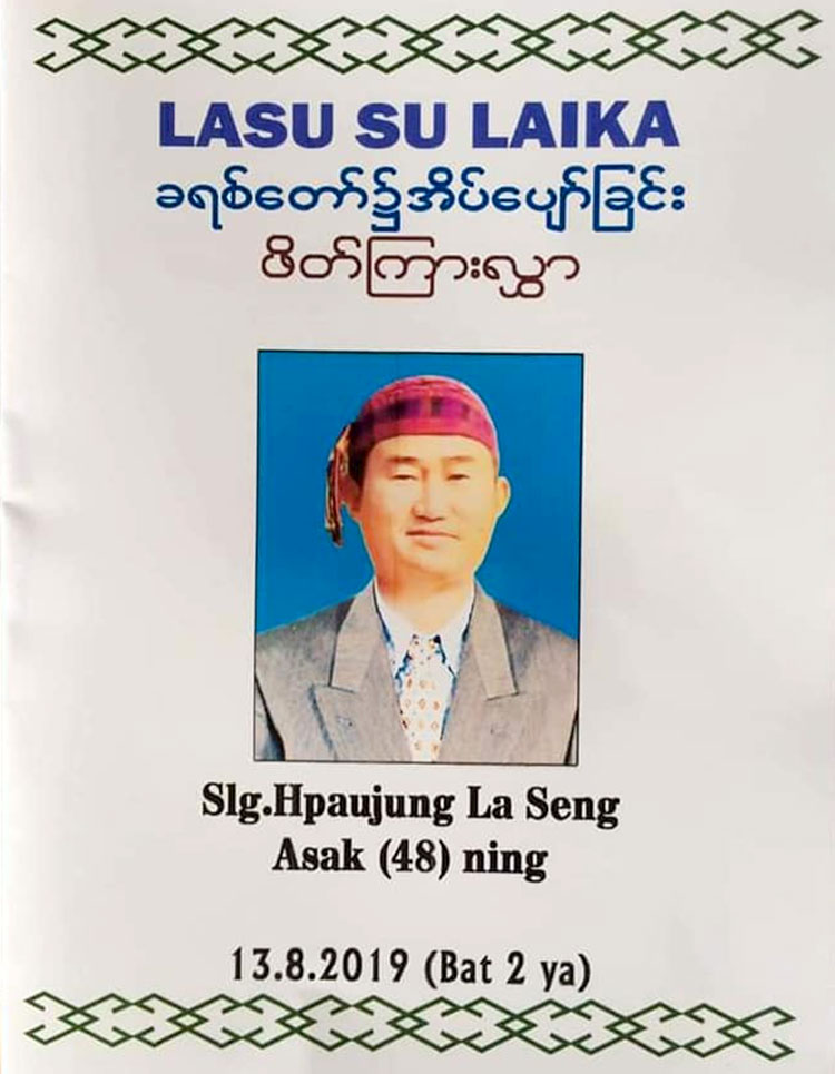 ဦး Hpaujung La Seng ၏ ရုပ်အလောင်း မြေမြှုပ်သြင်္ဂိုလ် ဆုတောင်းပွဲကို သြဂုတ်လ (၁၃) အင်္ဂါနေ့ ဖားကန့် မိသားစုနေအိမ်တွင် ပြုလုပ်သွားမည်ဖြစ်သည်။