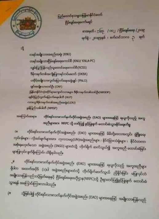 EAO များအနေဖြင့် အကူအညီများ ရယူလိုပါက အမျိုးသား ပြန်လည်သင့်မြတ်ရေးနှင့် ငြိမ်းချမ်းရေး ဗဟိုဌာန NRPC သို့ ဦးစွာ တင်ပြ၍ ခွင့်ပြုချက် တောင်းခံသွားရန် အကြောင်းကြားလာကြောင်း၊ NRPC ၏ မူဝါဒများနှင့် လမ်းညွှန်ချက်များကို သိရှိလိုက်နာ ညှိနှိုင်းဆောင်ရွက်ရန် အစိုးရငြိမ်းချမ်းရေးကော်မရှင်အဖွဲ့၏ ညွှန်ကြားချက်တွင် ဖော်ပြထားသည်ဟု ဆိုသည်။