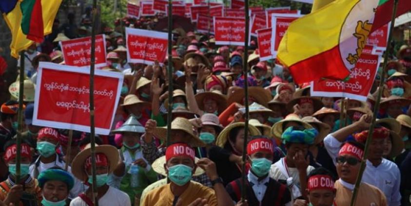 လူပေါင်းများစွာ ၏ နဖူးတွင် “ No Coal” ဆိုသည့် အနီရောင် နဖူးစည်း ပတ်ကာ တချို့မှာ လက်ပတ်တွင် ပတ်ထားကြပြီး လူထု ဆန္ဒထုတ်ဖော်မှု ပြုလုပ်ခဲ့သည်။