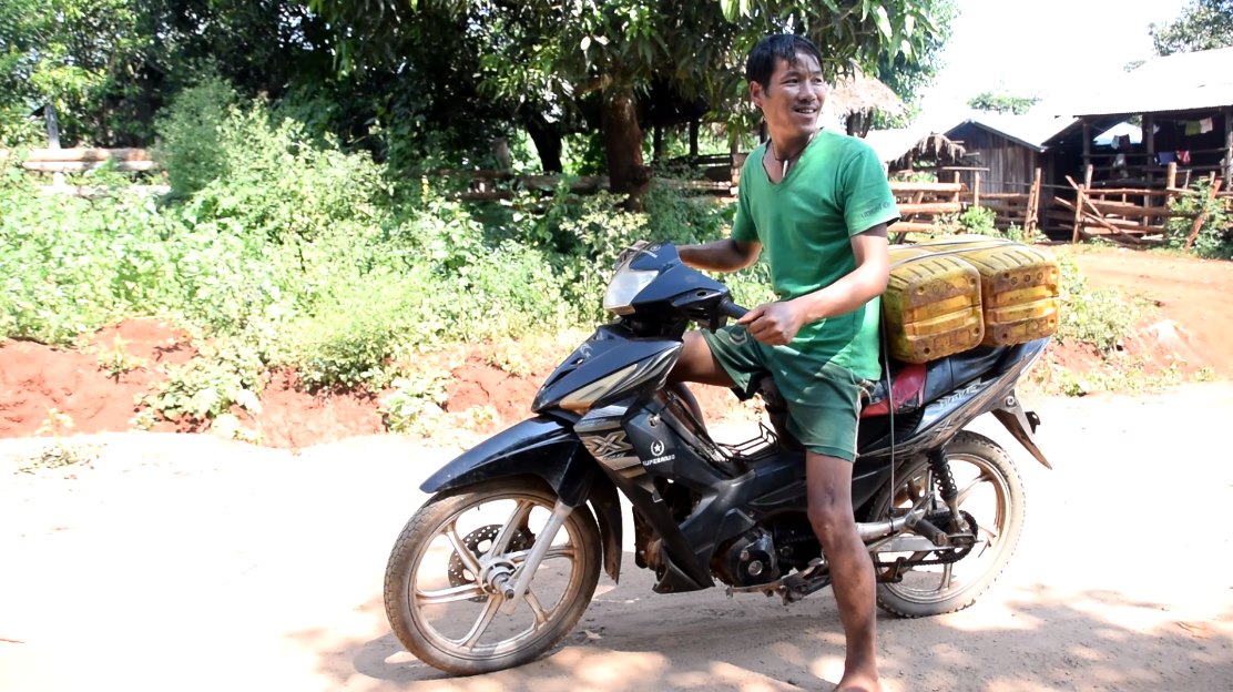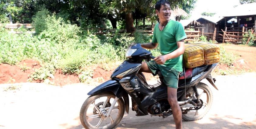 နာရီဝက်အကြာဆိုင်ကယ်ဖြင့် ဖဲလျားကျေးရွာသို့ ရေသွားခပ်မည့် ဒေါပဲ့ဒူကျေးရွာမှ ဒေသခံတစ်ဦး (ဓါတ်ပုံ – မော်ဦးမြာ)