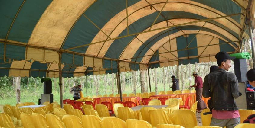 ဒေသခံများက “ကမ်းလွန်ပင်လယ်ပြင် ထောက်ပံ့ရေး စခန်းအလိုမရှိ” စာတမ်းများကိုင်ဆောင်ပြီး ဓမင်းဆိပ်ရွာသစ် လမ်းတစ်ဖက်တစ်ချက်၌ မတ်တပ်ရပ်ဆန္ဒထုတ်ဖော်ပြသနေသည့်အတွက် မကျင်းပဖြစ်ကြောင်း ထောက်ပံ့ရေးစခန်းကုမ္ပဏီအကျိုးဆောင် ကိုနိုင်ဦးက မွန်သတင်းအေဂျင်စီကို ပြောသည်။