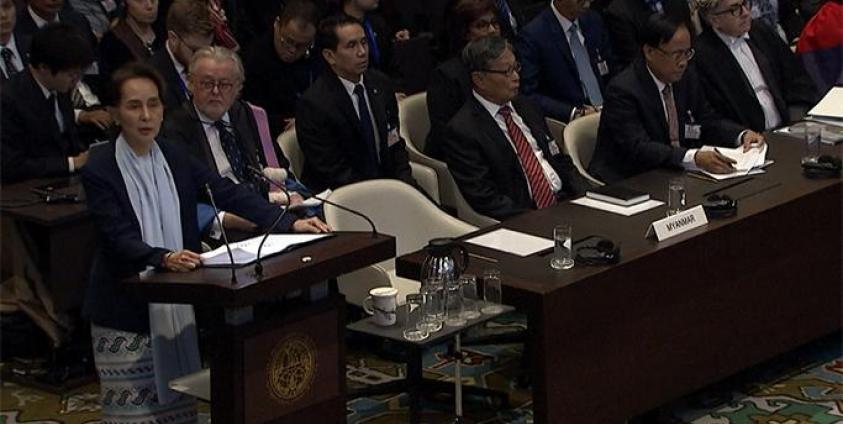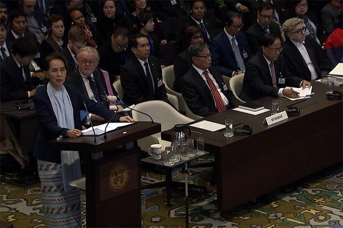 အလားတူ မြန်မာနိုင်ငံကိုယ်စားသွားရောက်ခဲ့သည့် နိုင်ငံတော်အတိုင်ပင်ခံပုဂ္ဂိုလ်၊ နိုင်ငံခြားရေးဝန်ကြီးဌာန ပြည်ထောင်စုဝန်ကြီး ဒေါ်အောင်ဆန်းစုကြည်ကလည်း ဂမ်ဘီယာ၏ စွဲဆိုမှုများသည် ဥပဒေအကြောင်းရ ခိုင်မာမှု မရှိဘဲ ထုတ်နှုတ်ကိုးကားထားခြင်းမျိုးသာ ဖြစ်သည့်အတွက် စွဲချက်ကိုပယ်ဖျက်ပေးရန်ပြောကြားခဲ့သည်။