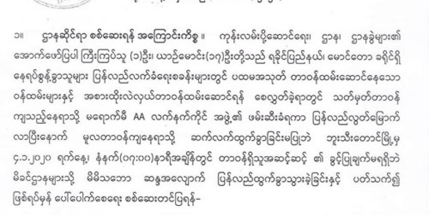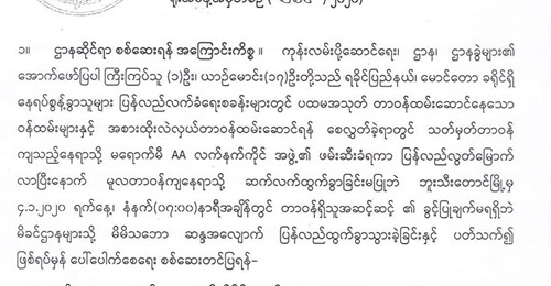 ပို့ဆောင်ရေးနှင့်ဆက်သွယ်ရေးဝန်ကြီးဌာန ကုန်းလမ်းပို့ဆောင်ရေး၏ ရုံးမိန့်အမှတ် (၀၀၆/၂၀၂၀) ဖြင့် ထုတ်ပြန်သော အမိန့်စာတွင် ကြီးကြပ်သူ (၁) ဦး၊ ယာဉ်မောင်း (၁၇) ဦးတို့သည် ရခိုင်ပြည်နယ်၊ မောင်တောခရိုင်ရှိ နေရပ်စွန့်ခွာ သူများ ပြန်လည်လက်ခံရေး စခန်းများတွင် ပထမအသုတ် တာဝန်ထမ်းဆောင်နေသော ဝန်ထမ်းများနှင့် အစားထိုး လဲလှယ် တာဝန်ထမ်းဆောင်ရန် စေလွှတ်ခဲ့ရာတွင် သတ်မှတ်တာဝန်ကျသည့် နေရာသို့ မရောက်မီ AA လက်နက်ကိုင်အဖွဲ့၏ ဖမ်းဆီးခံရာ ပြန်လည် လွှတ်မြောက်လာပြီးနောက် မူလ တာဝန်ကျရာ နေရာသို့ ဆက်လက် ထွက်ခွာခြင်း မပြုဘဲ ဘူးသီးတောင်မြို့မှ ၄-၁-၂၀၂၀ နေ့ နံနက် ၇နာရီအချိန်တွင် တာဝန်ရှိသူ အဆင့်ဆင့်၏ ခွင့်ပြုချက်မရရှိဘဲ မိခင်ဌာနများသို မိမိသဘောဆန္ဒ အလျောက် ပြန်လည် ထွက်ခွာသွားခြင်းနှင့် ပတ်သက်၍ ဖြစ်ရပ်မှန် ပေါ်ပေါက်စေရေး စစ်ဆေးတင်ပြရန်ဟု ပါရှိသည်။