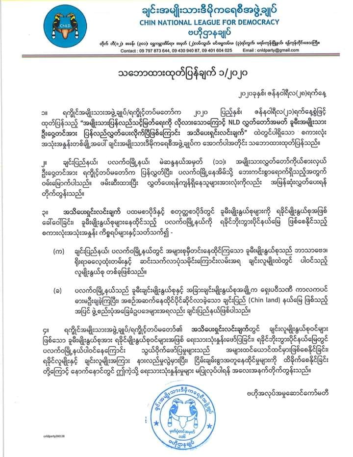 ရက္ခိုင့်တပ်တော်(အေအေ) အနေဖြင့် ချင်းလူမျိုးနွယ်စုဝင်ဖြစ်သော ခူမီးမျိုးနွယ်စုများကို ရခိုင်မျိုးနွယ်စုဝင်များအဖြစ် နောက်နောင်တွင် ရေးသားသုံးနှုန်းဖော်ပြခြင်း မပြုရန် ချင်းအမျိုးသားဒီမိုကရေစီအဖွဲ့ချုပ်(CNLD) ပါတီက သတိပေး ပြောဆိုလိုက်သည်။