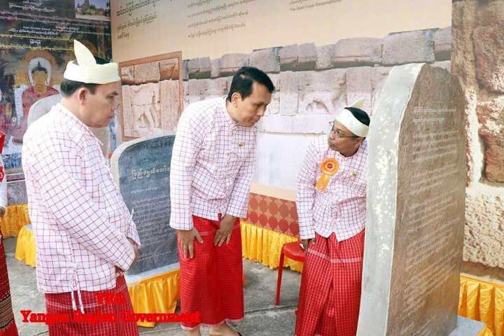 ရန်ကုန်တိုင်းဝန်ကြီးချုပ်အား မွန်စာပေယဉ်ကျေးမှုကော်မတီဥက္ကဌက မွန်ကျောက်စာအကြောင်း ရှင်းလင်းပြသစဉ်(Nai Soe Aung)