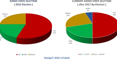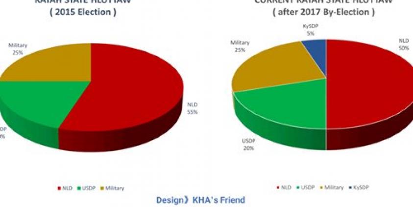 ၂၀၁၇ ခုနှစ် ကြားဖြတ် ရွေးကောက်ပွဲအပြီး လက်ရှိ ကယားပြည်နယ်လွှတ်တော်ကို ပြည်သူလူထုမှ ရွေးကောက်တင်မြောက်သည့် 75% လွှတ်တော်ကိုယ်စားလှယ် ( ၁၅ ) ဦးတွင် အမျိုးသားဒီမိုကရေစီအဖွဲ့ချုပ် ( NLD ) မှ ( ၁၀ ) ဦး ၊ ပြည်ထောင်စုကြံ့ခိုင်ရေးနှင့်ဖွံ့ဖြိုးရေးပါတီ ( USDP ) မှ ( ၄ ) ဦး ၊ ကယားပြည်နယ် ဒီမိုကရက်တစ်ပါတီ ( KySDP ) မှ ( ၁ ) ဦးနှင့် 25% တပ်မတော်သား ပြည်နယ်လွှတ်တော်ကိုယ်စားလှယ် ( ၅ ) ဦး ဖြင့် ဖွဲ့စည်းထားသည်ကို တွေ့ရပေမည်။