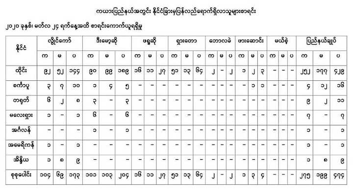 အကြောင်းအမျိုးမျိုးကြောင့် ပြည်ပသို့ ရောက်ရှိနေပြီး ယခု မတ်လအတွင်း ကယား (ကရင်နီ) ပြည်နယ်သို့ ပြန်လည် ရောက်ရှိလာသူ ဦးရေ ၄၇၄ ဦးရှိကြောင်း ကယားပြည်နယ် အစိုးရက မတ်လ ၂၅ ရက်တွင် ထုတ်ပြန်ထားသည့် အချက်အလက်များအရ သိရှိရသည်။