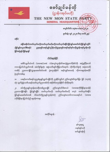 မင်းသစ္စာခိုင် — မွန်ပြည်သစ်ပါတီ ထိန်းချုပ်နယ်မြေများတွင် ကိုရိုနာဗိုင်းရပ် Covid-19 ကာကွယ်မှုအစီအစဉ်များ ဆောင်ရွက်သွားရန် သက်ဆိုင်ရာ ခရိုင်၊ မြို့နယ်နှင့် ကျန်းမာရေးဌာနအသီးသီးထံ မွန်ပြည်သစ်ပါတီက မတ်လ ၂၅ ရက်စွဲဖြင့် ညွှန်ကြားချက်တစ်စောင် ပေးပို့လိုက်သည်။