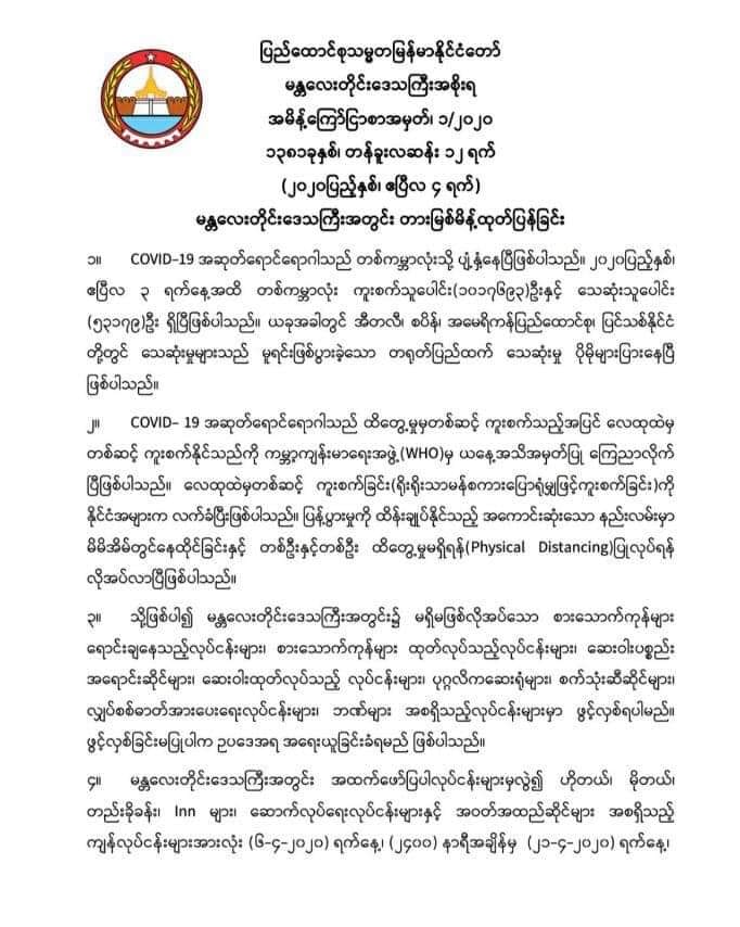 မန္တလေးတိုင်းဒေသကြီးအတွင်း မရှိမဖြစ် လိုအပ်သော စားသောက်ကုန် ထုတ်လုပ်ရောင်းချသည့် လုပ်ငန်းများ၊ ဆေးဝါးထုတ်လုပ်ခြင်းနှင့် အရောင်းဆိုင်များ၊ ပုဂ္ဂလိကဆေးရုံများ၊ စက်သုံးဆီဆိုင်များ၊ လျှပ်စစ်ဓါတ်အားပေးရေးလုပ်ငန်းများ၊ ဘဏ်များ အစရှိသည့် လုပ်ငန်းများမှလွဲ၍ အခြားလုပ်ငန်းများအားလုံးကို ဧပြီ ၆ ရက်နေ့မှစတင်၍ နှစ်ပတ်ကြာ ယာယီပိတ်သိမ်းကြောင်း တိုင်းဝန်ကြီးချုပ်က ဧပြီ ၄  ရက်စွဲဖြင့် တားမြစ်မိန့် ထုတ်ပြန်လိုက်သည်။