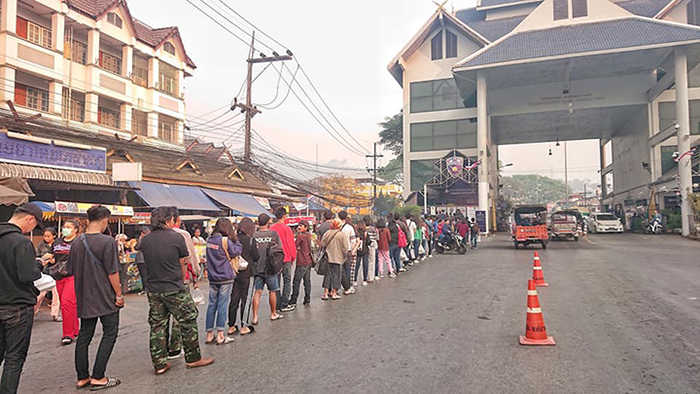 တာချီလိတ်-မယ်ဆိုင်ဂိတ်တွင် သျှမ်းပြည်ပြန်ရန်တန်းစီနေသော ထိုင်းနိုင်ငံရောက်သျှမ်းပြည်သားရွှေ့ပြောင်းအလုပ်သမားများ။