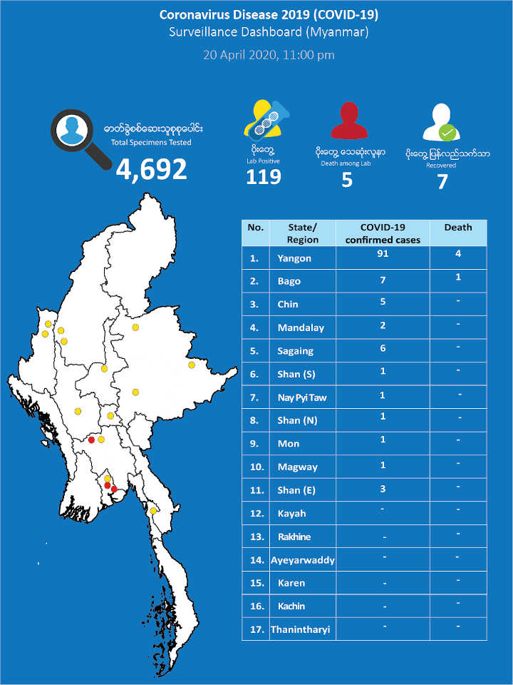COVID-19 ရောဂါ ကာကွယ်ထိန်းချုပ်နိုင်ရေး မြန်မာနိုင်ငံတွင် ဆောင်ရွက်နိုင်ရန်ကန်ဒေါ်လာ သန်း ၅၀ ထုတ်ချေးပေးသွားမည်ဖြစ်ကြောင်း ကမ္ဘာ့ဘဏ်က ဧပြီ ၂၀ တွင် သတင်းထုတ်ပြန်လိုက်သည်။