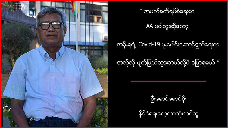 အခုလက်ရှိ မြန်မာနိုင်ငံမှာ တိုက်ပွဲအပြင်းအထန်ဖြစ်နေတာက AA နဲ့ဖြစ်နေတာ။ အဲ့ဒါနဲ့ပတ်သက်ပြီးတော့ AA ကို အကြမ်းဖက်အဖွဲ့လို့ပဲ သတ်မှတ်ထားတယ်။ ပူးပေါင်းဆောင်ရွက်ရေး၊ စေ့စပ်ဆွေးနွေးပွဲတွေ မလုပ်ဘူးဆိုရင်တော့ ဒီစစ်ပွဲက ဘယ်တော့မှ ရပ်တန့်နိုင်မှာမဟုတ်သလို Covid-19 အတွက် ပူးပေါင်းဆောင်ရွက်နိုင်မှာလည်း မဟုတ်ဘူးလေ။
