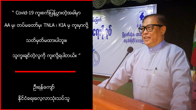 အဲဒီဟာကို ငြိမ်းချမ်းရေးဖြစ်စဉ်ပေါ်မှာ မူတည်လို့မဟုတ်ဘဲနဲ့ ကိုဗစ်နဲ့ပတ်သက်လို့ သတ်မှတ်ထားတဲ့ နယ်မြေထဲမှာ ရခိုင်ပြည်နယ် မပါဆိုတာ။ ရခိုင်ပြည်သူတွေကို သပ်သပ်ကွက်ပြီးတော့ ချန်ထားခဲ့တယ်လို့မြင်တယ်။ ဒါမျိုးတွေက မဖြစ်သင့်ဘူး။ ကိုဗစ်ဆိုတာက တစ်နေရာဖြစ်ရင် တစ်နိုင်ငံလုံးမှာ ပြန့်ပွားနိုင်တဲ့အတွက် ရခိုင်မြောက်ပိုင်းကို ကွက်ပြီးတော့ ချန်ထားခဲ့တယ်ဆိုတာ အစိုးရမှာ စိတ်ရင်းစေတနာအမှန်၊ ရည်ရွယ်ချက်အမှန် မရှိဘူးလို့ ပြောချင်တယ်။ ဒါ AA ကို ပြစ်ဒဏ်ပေးရာ မကျဘဲ ရခိုင်ပြည်မြောက်ပိုင်းက ပြည်သူတွေကို ချန်လှပ်ထားတာနဲ့ တူနေတယ်။
