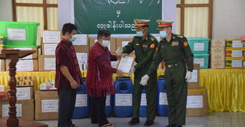 တပ်မတော်(ကြည်း၊ရေ၊လေ)မှ Surgical Mask (10000) ၊ N-95 (500)၊ Face Shield (250)၊ Bleaching Powder 50-kg (5)၊ PPE (100)၊ Examination Glove (100’s) (1000)၊ Hand Gel (150)၊ Hand Sanitizer (150) စတဲ့ ထောက်ပံ့ပစ္စည်းအပါအဝင် တယ်လို့သိရပါတယ်။