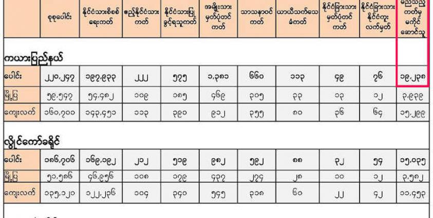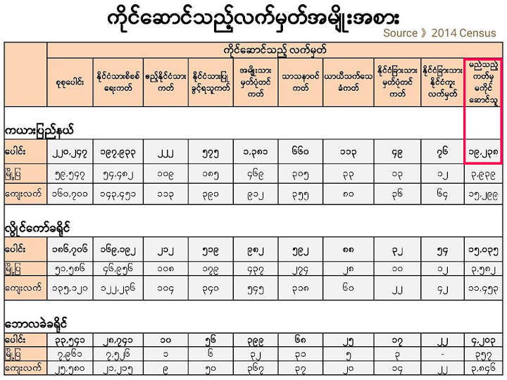 ယနေ့အချိန်ထိ အလုပ်သမား၊ လူဝင်မှုကြီးကြပ်ရေးနှင့် ပြည်သူ့အင်အားဝန်ကြီးဌာန မှ ကယားပြည်နယ်၏ ၂၀၂၀ အတွင်းနောက်ဆုံးရ လူဦးရေကို ထုတ်ပြန်ခြင်းမရှိသေးသလို နှင့် ပြည်ထောင်စုရွေးကောက်ပွဲကော်မရှင်မှ ဆန္ဒမဲပေးပိုင်ခွင့် လူဦးရေ စာရင်းကို ထုတ်ပြန်ကြေညာခြင်းမရှိသေးပါဘူး။