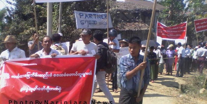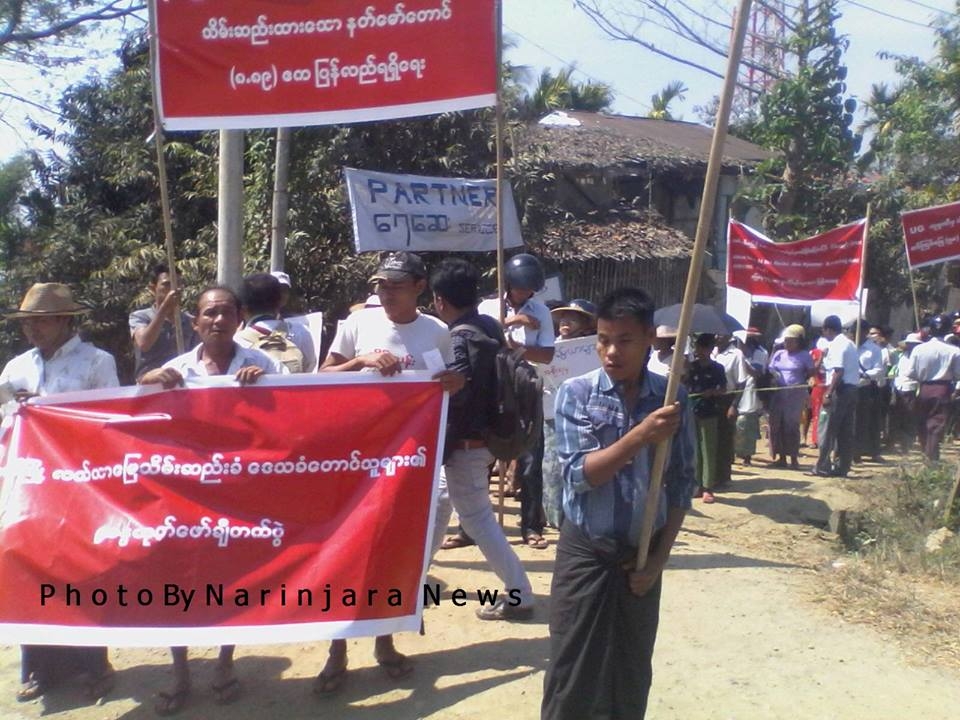 ရခိုင်ပြည်နယ် သံတွဲမြို့ ငပလီမြို့တွင် လူပေါင်း ၃၀၀ ခန့်က သိမ်းဆည်းထားသော လယ်မြေများကို ပြန်လည် ရရှိရေး အတွက် ငြိမ်းချမ်းစွာ တောင်းဆိုဆန္ဒဖော်ထုတ်နေကြသည်ဟု သိရသည်။