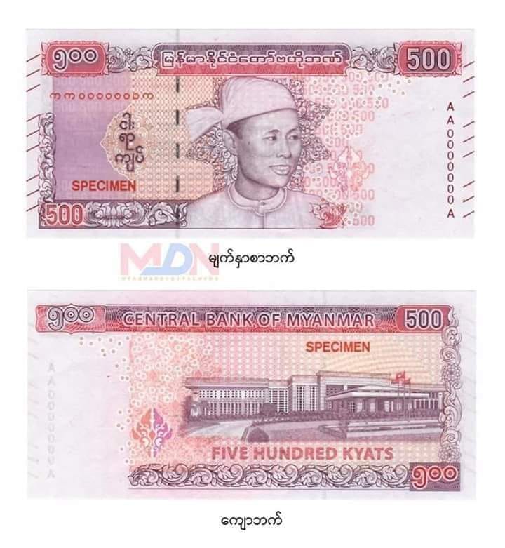 လာမည့် ဇူလိုင်လ ၁၉ ရက် အာဇာနည်နေ့တွင် ဗိုလ်ချုပ်အောင်ဆန်းပုံဖြင့် ကျပ် ၅၀၀ တန် ငွေစက္ကူကို ထုတ်ဝေမည်ဟု အစိုးရက ကြေငြာထားသည်။