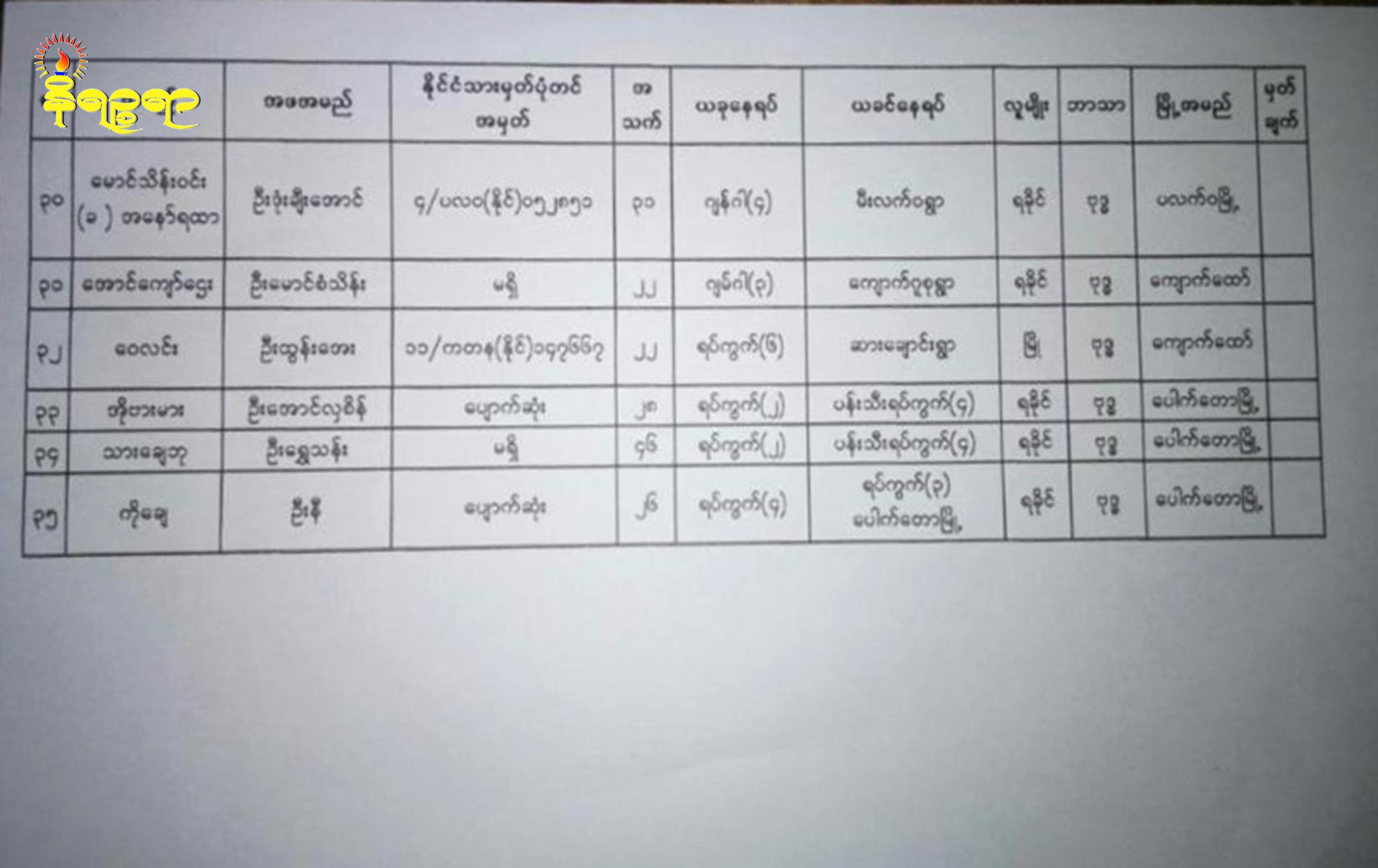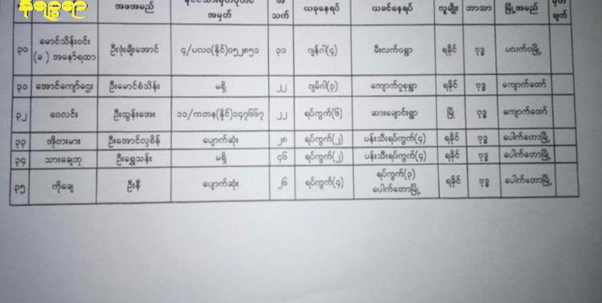 နောက်ပြီး မြောက်ဦးမြို့နယ်၊ မော်ရွာသစ်ကျေးရွာမှ မင်းခန့်ကျော် (၂၂) နှစ်၊ မင်းပြားမြို့နယ်၊ ချောင်းရှည်ကျေးရွာမှ လှတင်ထွန်း (၂၉) နှစ်၊ မင်းအေးစိုး (၁၆) နှစ်၊ နိုင်ဝင်းဦး (၁၇) နှစ်၊ဆန်းအေးမောင် (၂၄) နှစ်၊ နိုင်နိုင်ချေ (၁၇) နှစ်၊ ဦးဝင်းလှိုင် (ခ ) ဦးသန်းလှိုင် (၄ဝ) နှစ်တို့ဖြစ်ကြသည်။
