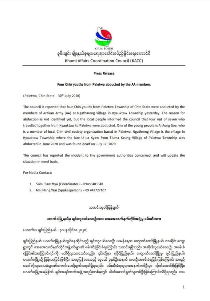 ၎င်း ချင်းလူငယ် လေးဦးကို ရခိုင်တပ်(AA)အဖွဲ့က ရခိုင်ပြည်နယ်၊ ကျောက်တော်မြို့နယ်မှ ချင်းပြည်နယ် ပလက်ဝမြို့သို့ ပြန်လာချိန်တွင် ဖမ်းဆီးခဲ့ခြင်းဖြစ်ကြောင်း ခူမီးချင်းမျိုးနွယ်စုများရေးရာ ပေါင်းစပ်ညှိနှိုင်းရေး ကော်မတီ (KACC)မှ ပြောခွင့်ရပုဂ္ဂိုလ် မမိုင်နန်းဝေကပြောသည်။