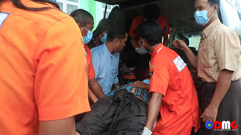 ပစ်ခတ်ခံရ၍ ကျည်ထိမှန်ဒဏ်ရာရရှိသွားသည့် ယာဉ်မောင်းဖြစ်သူ ကိုအောင်မျိုးသန်းအား စစ်တွေဆေးရုံကြီးသို့ ယူဆောင်လာစဉ်။