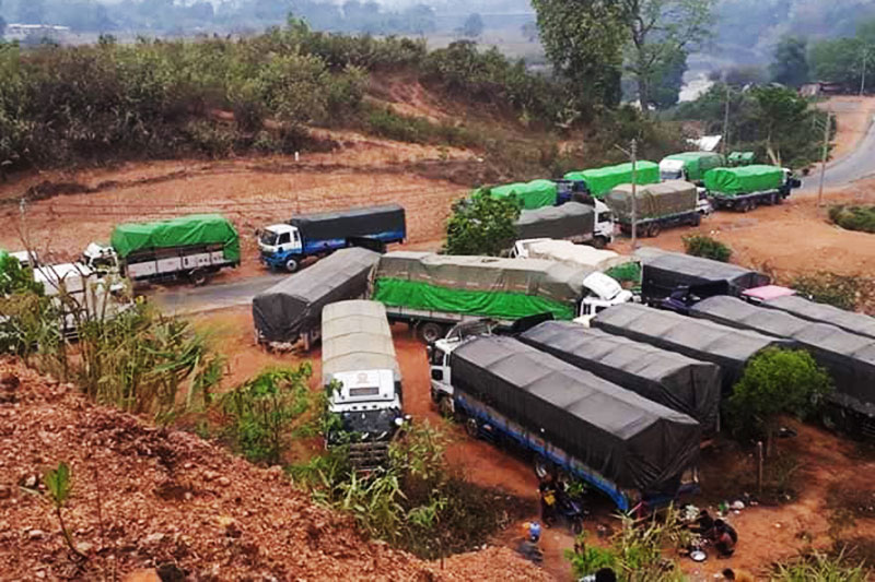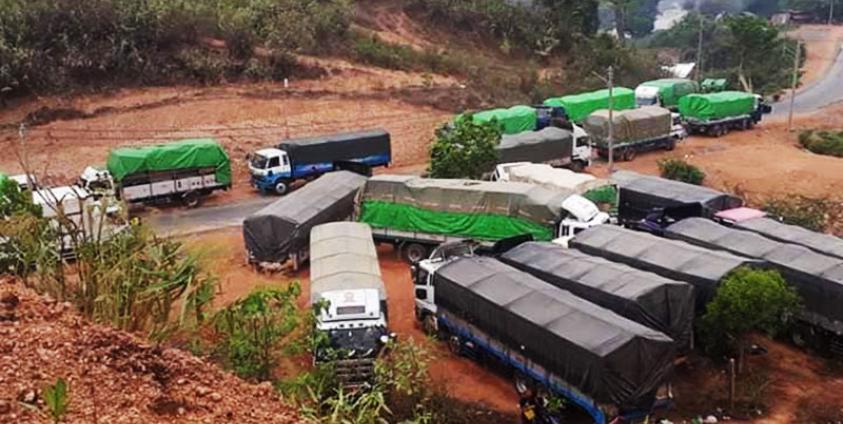 ပုံစာ - လုံခြုံရေးစိုးရိမ်ရသောကြောင့် အမ်းမြို့အနီးတွင် ရပ်နားထားသည့် ကုန်တင်ယာဉ်များကို ဧပြီလ ၂၇ နေ့က တွေ့ရစဉ်။ (Photo - K Than Aung's facebook)