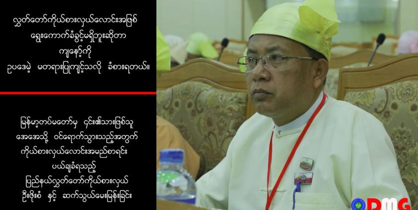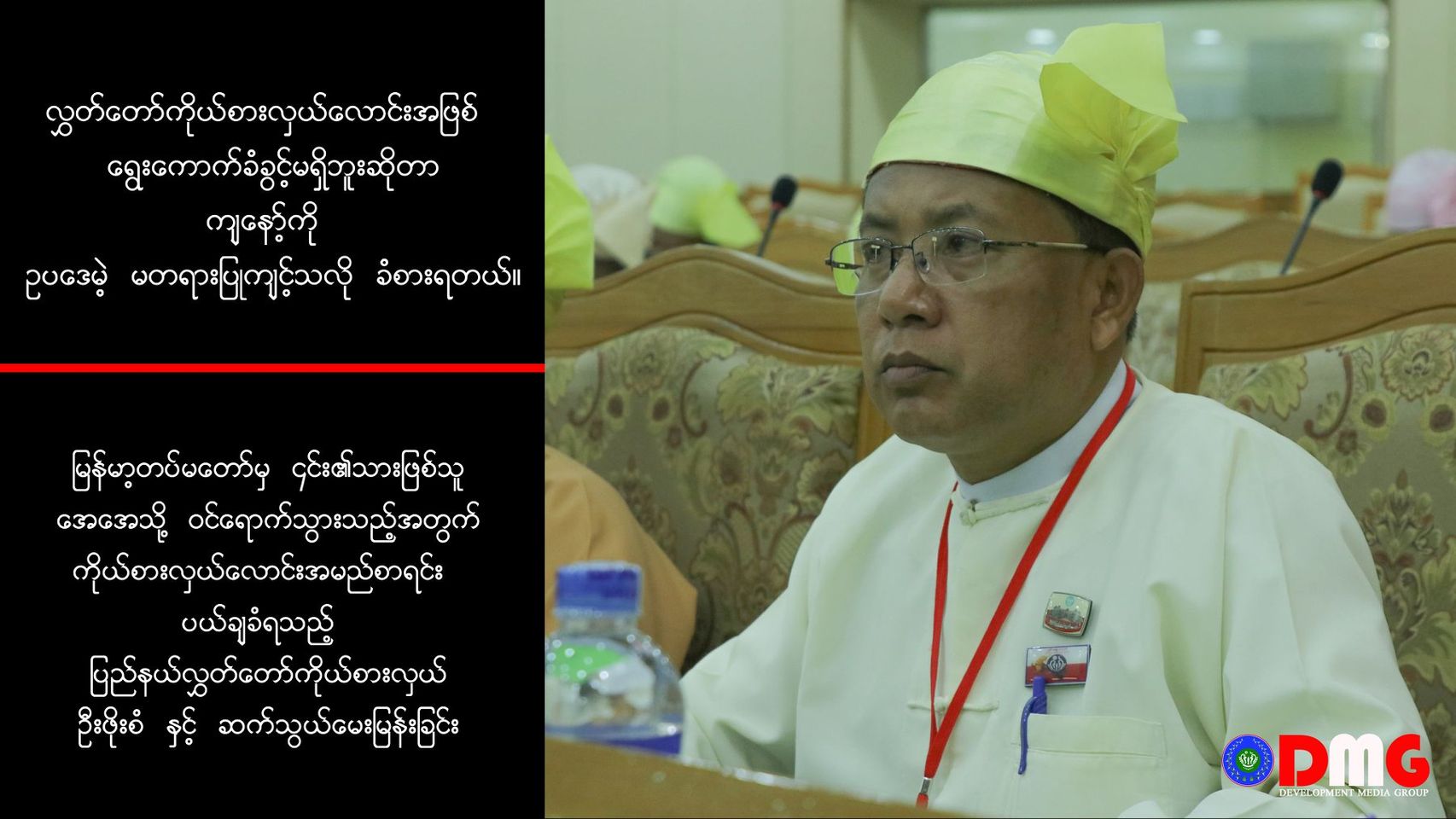 ဖြေ - ပြောချင်တာကတော့ နိုင်ငံတော်မှာ အခု ဖက်ဒရယ်ဒီမိုကရေစီ သမ္မတအနေနဲ့ သွားမယ်ဆိုပြီးရင် အစိုးရကလည်း တရားဝင် ကြေငြာထားပြီး ဖြစ်တယ်။ ပြည်တွင်းငြိမ်းရေးကိစ္စနဲ့လည်း သူတို့အစည်းအဝေးတွေ လုပ်နေတာတွေ ရှိတယ်။ အကုန်လုံး ဖက်ဒရယ်ဒီမိုကရေစီသမ္မတနိုင်ငံနဲ့ သွားမယ့်ကိစ္စမှာ ကျနော်တို့ရခိုင်လူမျိုးကို ကိုယ်စားပြုတဲ့ ရခိုင်အမျိုးသားပါတီက ကိုယ်စားလှယ်တစ်ဦးကို ဒီလိုလုပ်ခြင်းဟာ တကယ်စစ်မှန်ငြိမ်းချမ်းတဲ့ ဖက်ဒရယ်ဒီမိုကရေစီ ပန်းတိုင်ကို ရောက်မှာလား။ ကျနော်တို့လိုချင်နေတဲ့ ပြည်တွင်းငြိမ်းချမ်းရေး၊ တရားဥပဒေစိုးမိုးရေး၊ ကိုယ်ပိုင်ပြဌာန်းခွင့်နဲ့ ကိုယ်ပိုင်အုပ်ချုပ်ခွင့်တို့ ရရှိရေးဆိုတာ တကယ်ဖြစ်လာနိုင်မလား ဆိုတာကို မမြင်ဘူးလို့ထင်တယ်။ အဲအတွက်ကြောင့် ကျနော်ရဲ့ မဲဆန္ဒရှင်တွေကိုလည်း ပြောချင်တာက ရှေ့အနာဂတ်မှာ ကျနော်တို့ရဲ့ ရခိုင်ပြည် ဖက်ဒရယ်ဒီမိုကရေစီနဲ့ ကိုယ်ပိုင်ပြဌာန်းခွင့်၊ ကိုယ်ပိုင်အုပ်ချုပ်ခွင့်ရရှိရေးအတွက်ကို လက်တွဲပြီး ပူးပေါင်းဆောင်ရွက်သွားမယ်ဆိုတာကို ကျနော် ပြောချင်ပါတယ်။